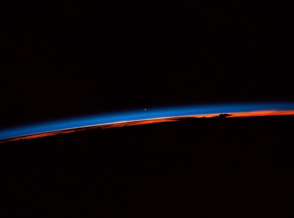STS-30 Earth observation captured by crewmembers onboard Atlantis, Orbiter Vehicle 104, shows the sunset over the Earth as well as the planet Venus near the center of the frame. Jutting clouds are seen on the horizon, just beneath the blue strip of airglow.