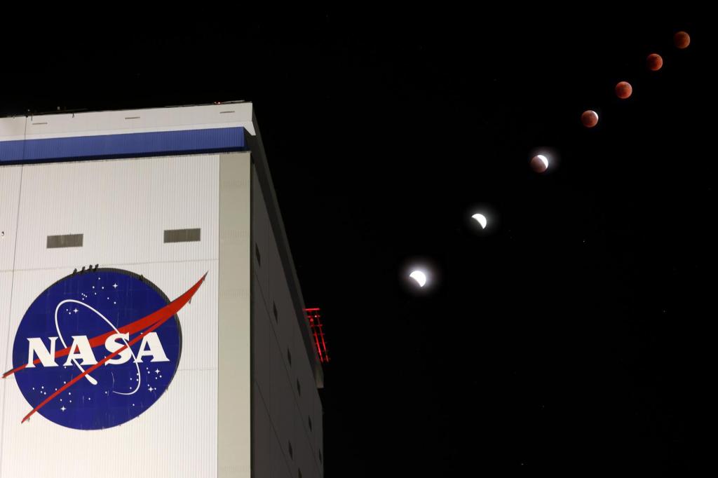 The Flower Moon lunar eclipse over NASA’s Michoud Assembly Facility in New Orleans is shown from the initial partial eclipse to totality in a composite of seven images shot on Sunday, May 15, 2022.